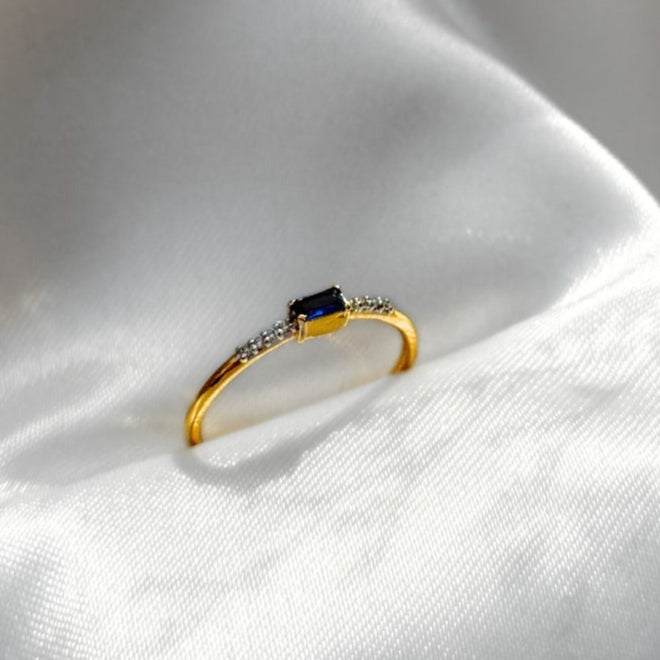 The Emery Ring features a deep navy center stone in an emerald cut, flanked by a delicate row of sparkling accents on each side. Set on a polished gold-plated band, this refined design adds a quiet sophistication to any ring stack or stands beautifully on its own.